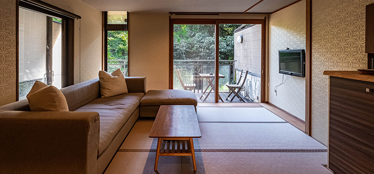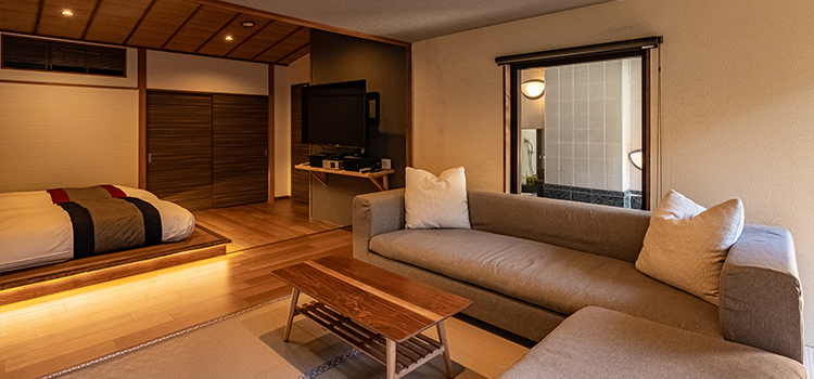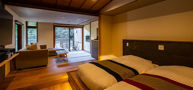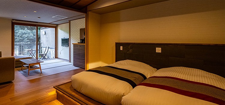 | 客室設備 | テレビ/電話/個別空調/体重計/有線LAN/コーヒーマシーン/紅茶・お茶マシーン/洗浄機付トイレ/冷蔵庫/羽毛布団/ローベッド×2(3名様以上はお布団になります)/ソファ |