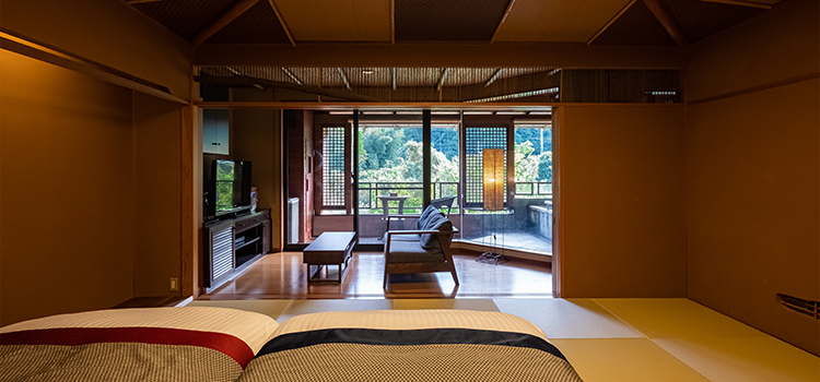 | 客室設備 | テレビ2台/DVDプレーヤー/電話/コーヒーマシーン/紅茶・お茶マシーン/個別空調/体重計/有線LAN/洗浄機付トイレ2か所 /CD・MDプレーヤーミニバー/冷蔵庫2台/羽毛布団/ローベッド×2(3名様以上はお布団になります)/ソファ |